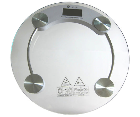 Digital Glass Personal Bathroom Scale with Weight, BMI, LCD Screen, and Low Battery Indicator. Round Clear Glass