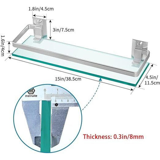 Glass Bathroom Shelf with Rail, 15" x 4.5" Rectangular Shower Caddy, Wall Mounted Floating Shampoo Holder for Lavatory, Kitchen, Living Room