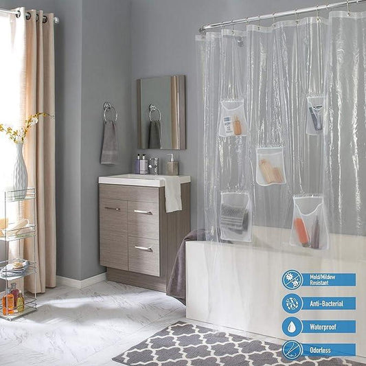 Bath Bliss Heavyweight PEVA Shower Liner - 70" x 72" with 5 Mesh Pockets for Storage of Tech, Tablets, iPads