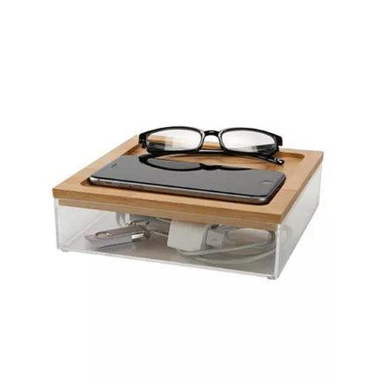 CLEAR COTTON PADS HOLDER W. BAMBOO LID AND ROUND KNOB