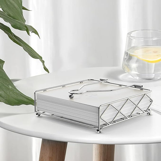Modern Napkin Holder for Tables, Horizontal Tissue Dispenser for Kitchen, Countertop, Dining or Picnic Table Decoration, Flat Cocktail Napkin Caddy, Silver