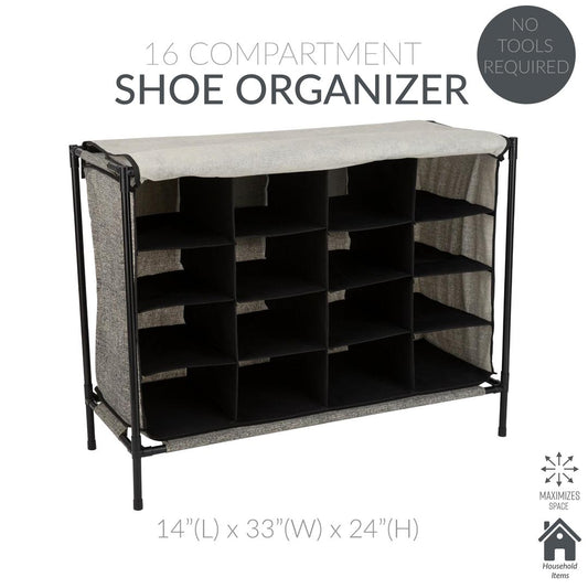 16 Compartment Shoe Cubby Organizer W/Cover, 4 Tiers - Black