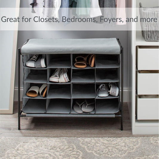 16 Compartment Shoe Cubby Organizer W/Cover, 4 Tiers - Grey