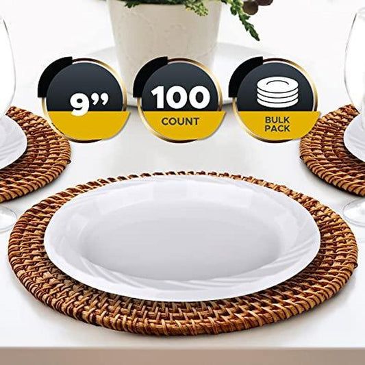 PAMI Premium Disposable Plastic Plates 9'' [Pack of 100] - White Party Plates for Dinner Desserts Appetizers