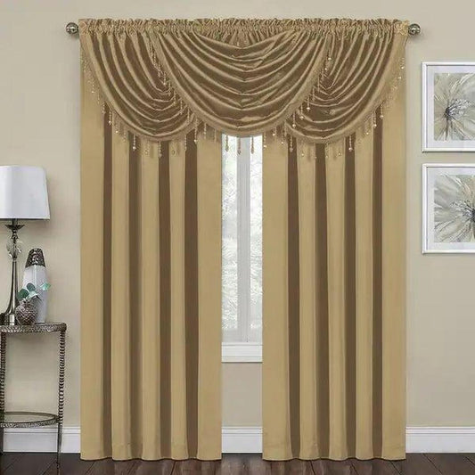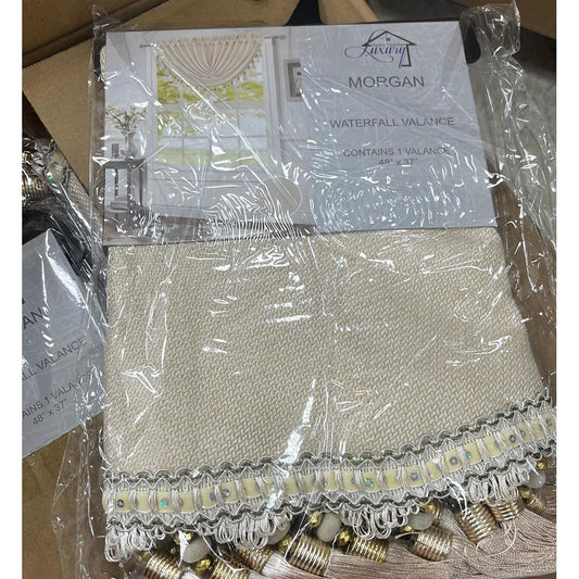Timeless Elegance: Morgan Beige Rod Pocket Waterfall Valance with Fringe Tassels - 48x37 Inches
