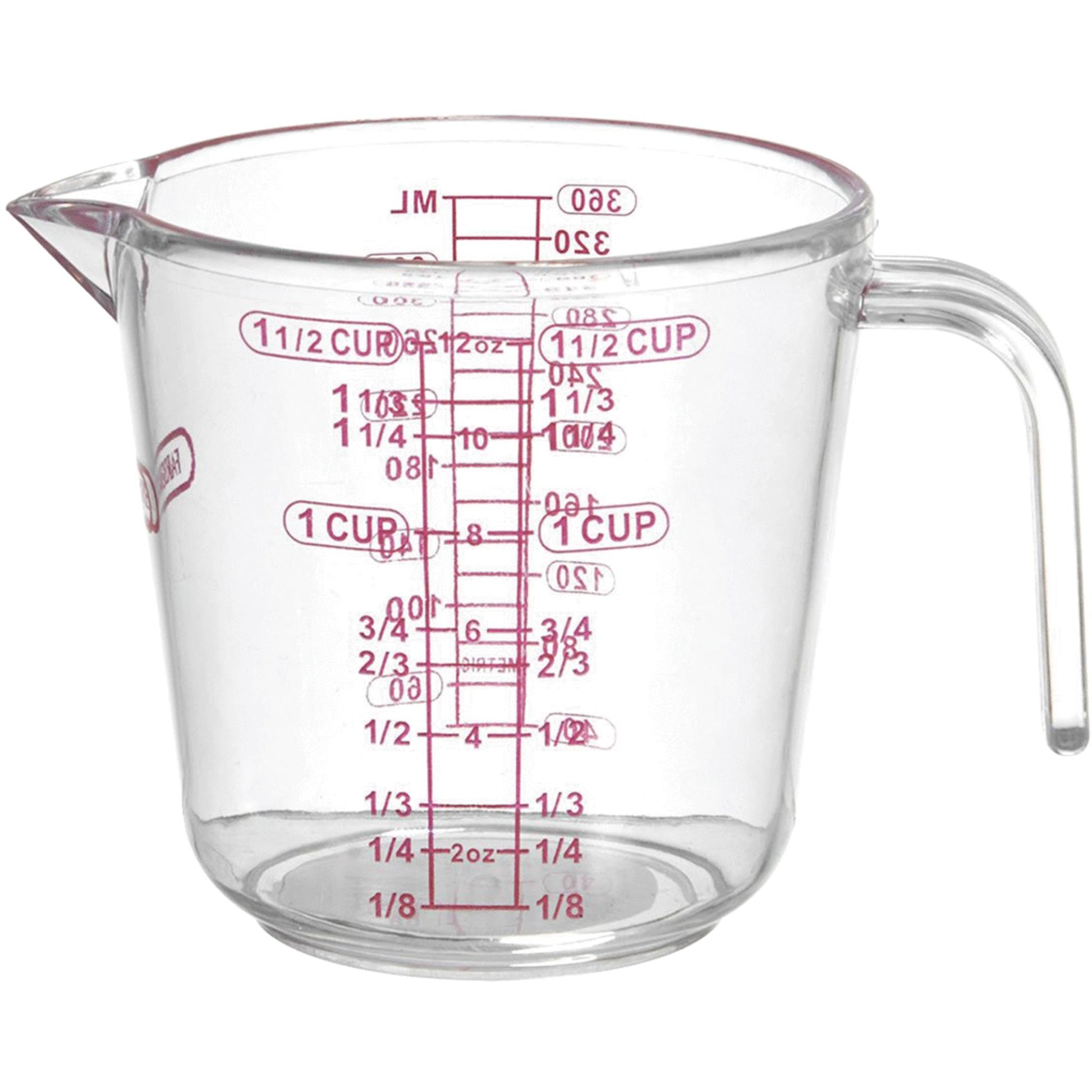 Farberware Classic 1.5 Measuring Cup is ideal for measuring wet and dry ingredients to ensure consistency in food preparation. Provides easy to read markings in standard and metric units up to 1.5 cups. The comfortable, easy-grip handle makes moving and pouring a snap. Dishwasher safe. Limited lifetime warranty. Capacity: 1.5 Cup Material: Plastic Standard of Measurement: Standard & Metric Color: Clear pack of 36.
